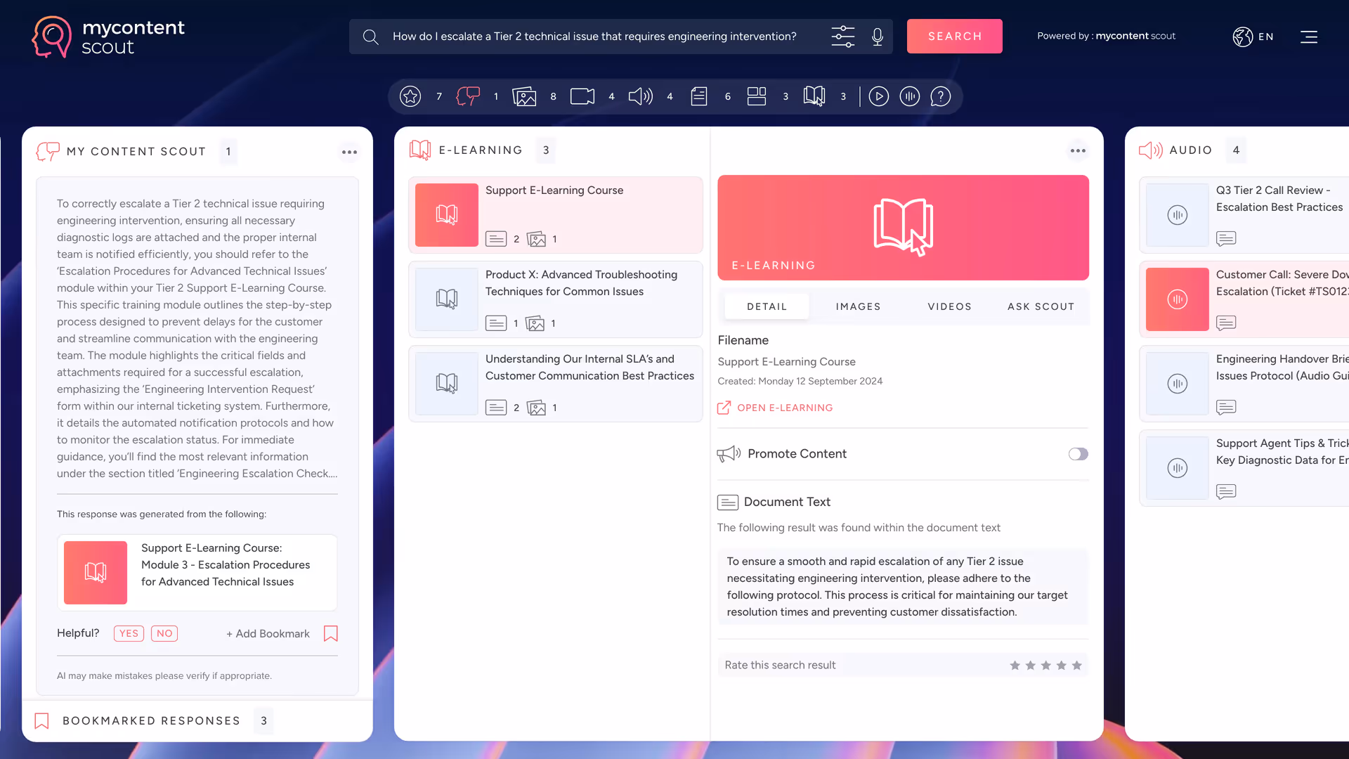MyContentScout delivers accurate information drawn from your organization’s trusted knowledge — and provides direct links to the source, so your teams always know where the answer comes from.