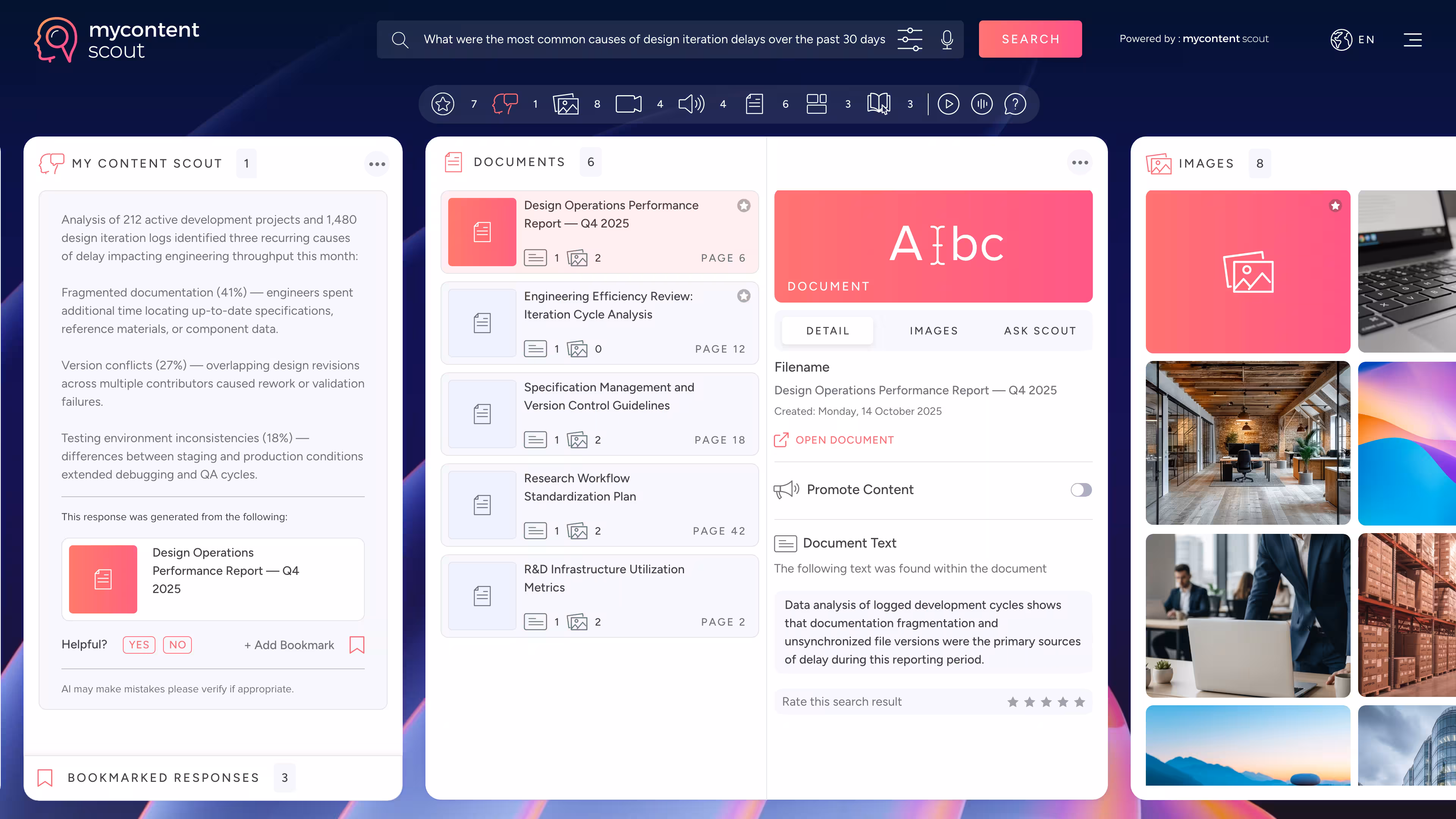 How MyContentScout Helps: Scout ensures that answers from the latest approved resources are always one question away, from style guides to product blueprints.